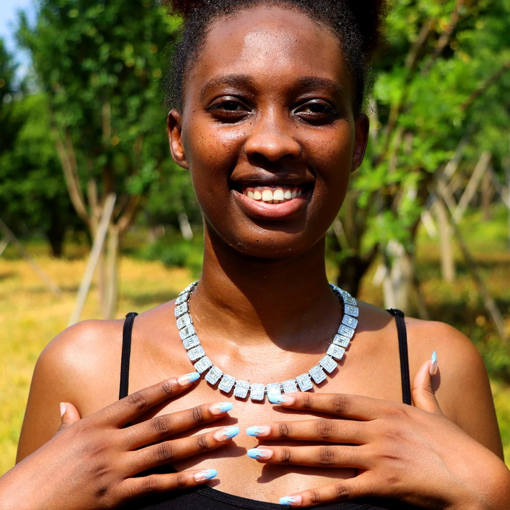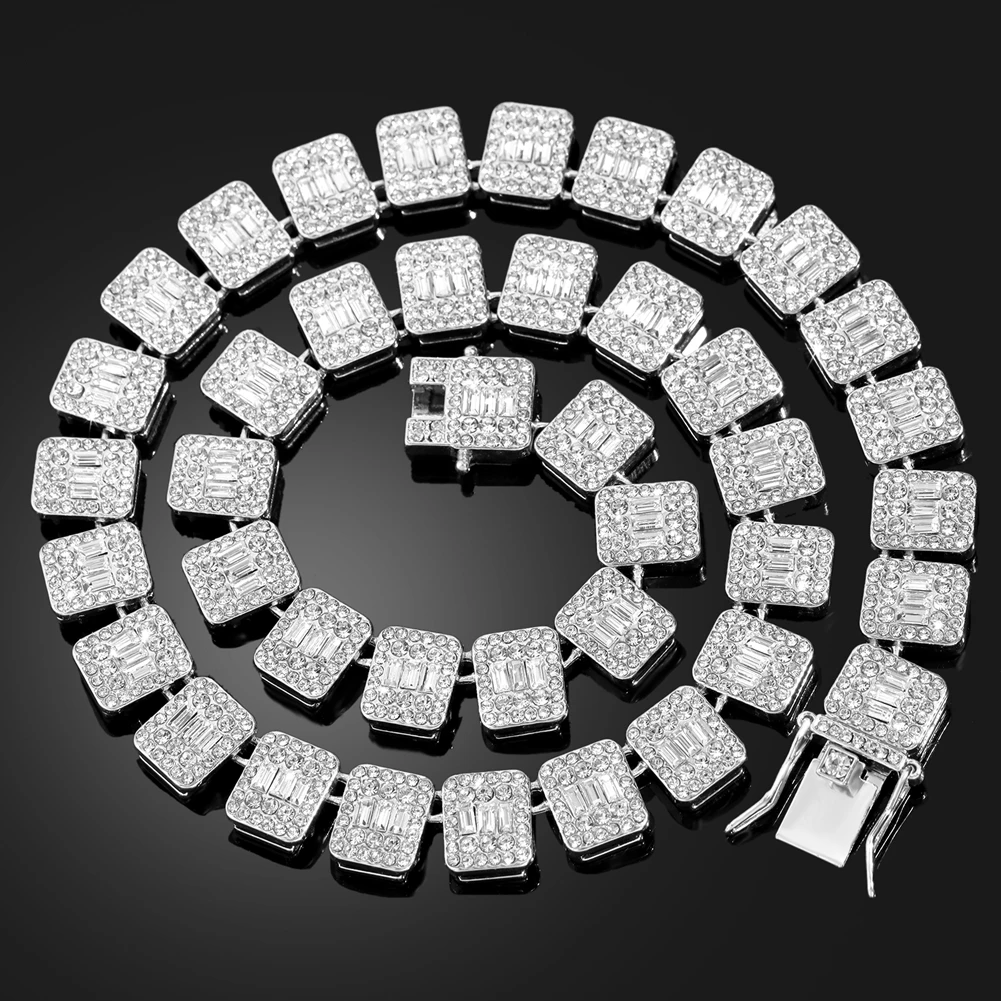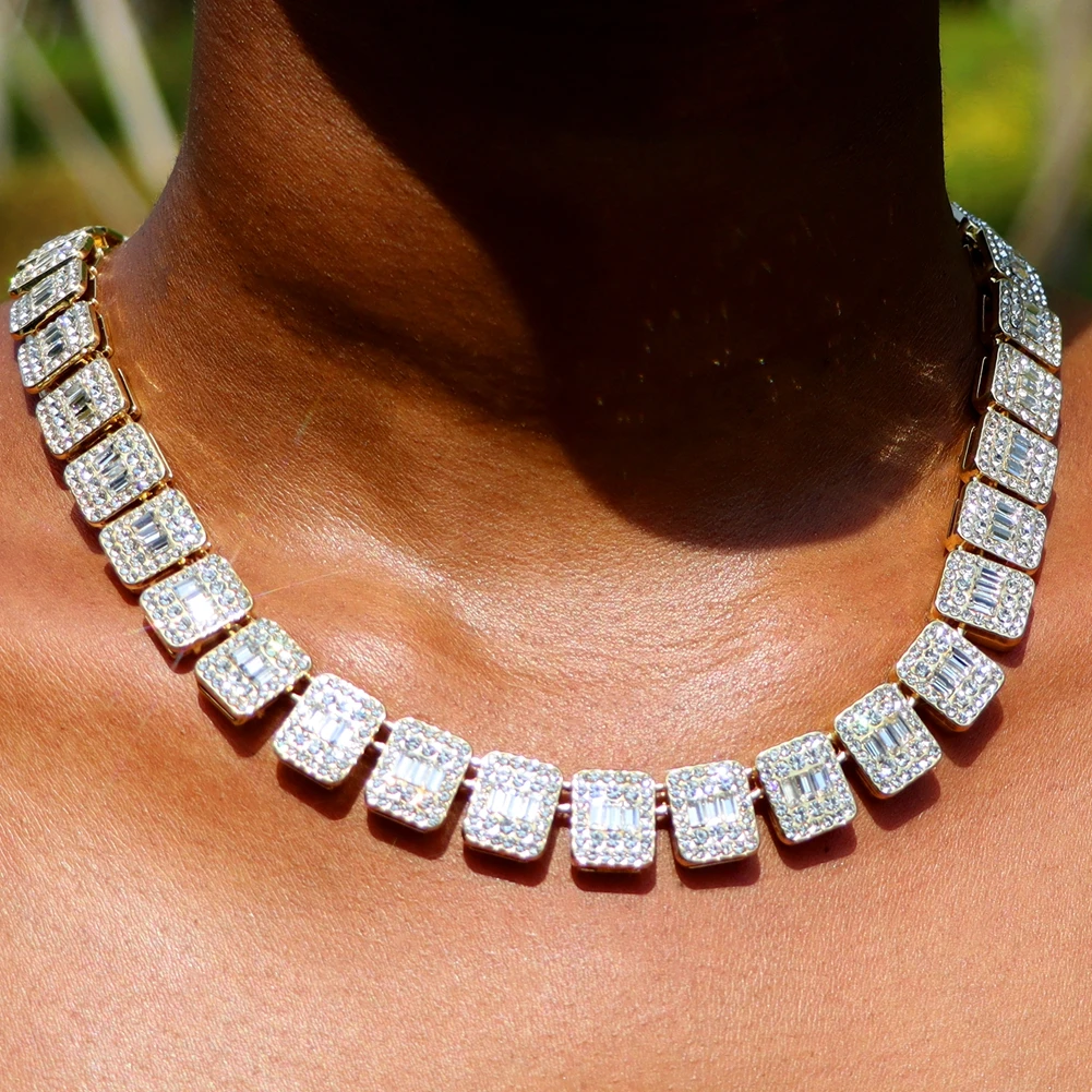 Collier tennis bling avec cristaux baguette carrés iced out ultra brillants. Chaîne cubaine or ou argent. Style hip hop luxe unisexe. Parfait soirées, mariages, quotidien.