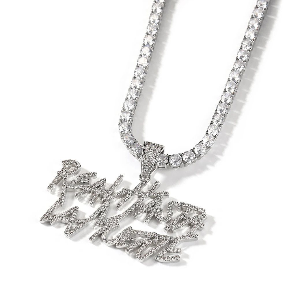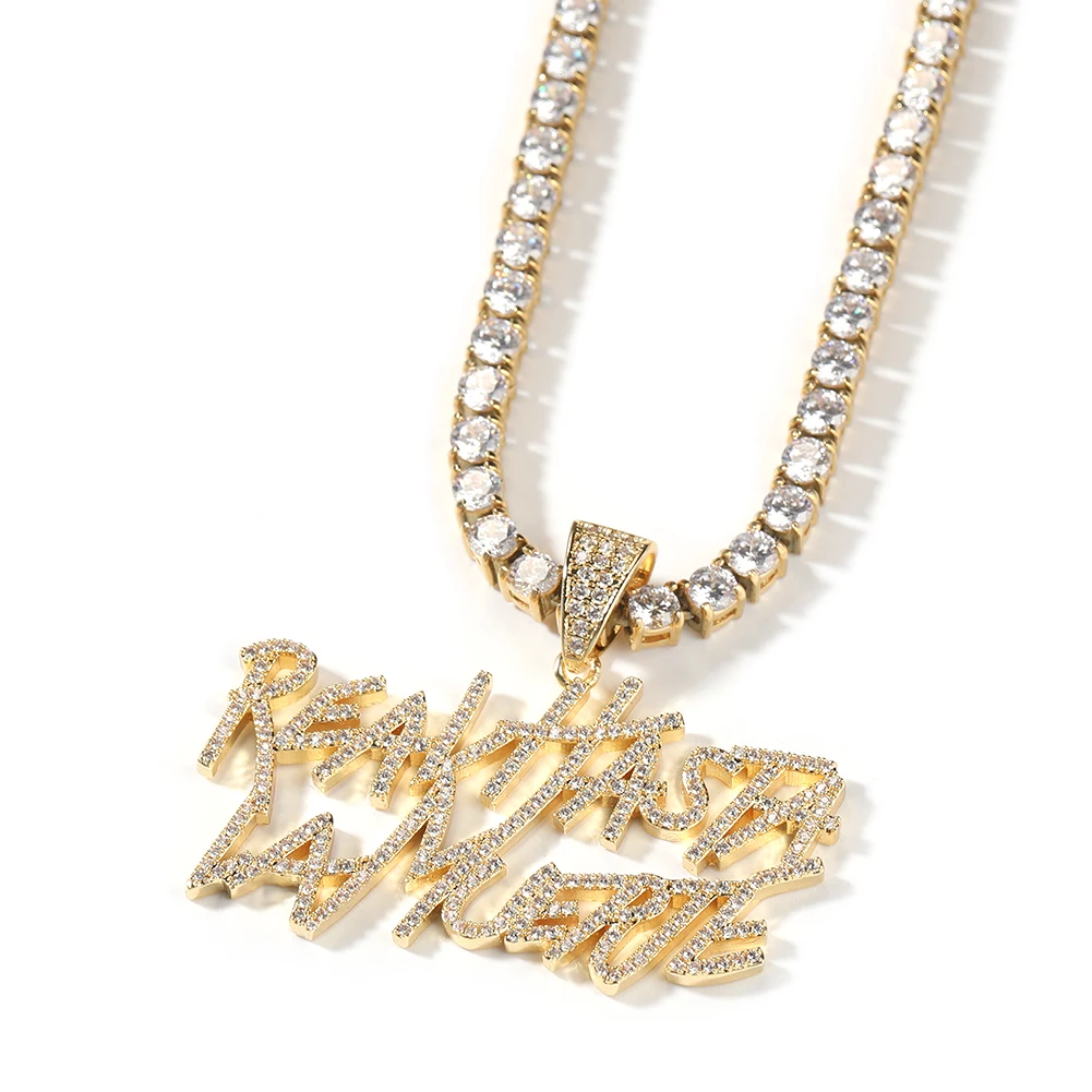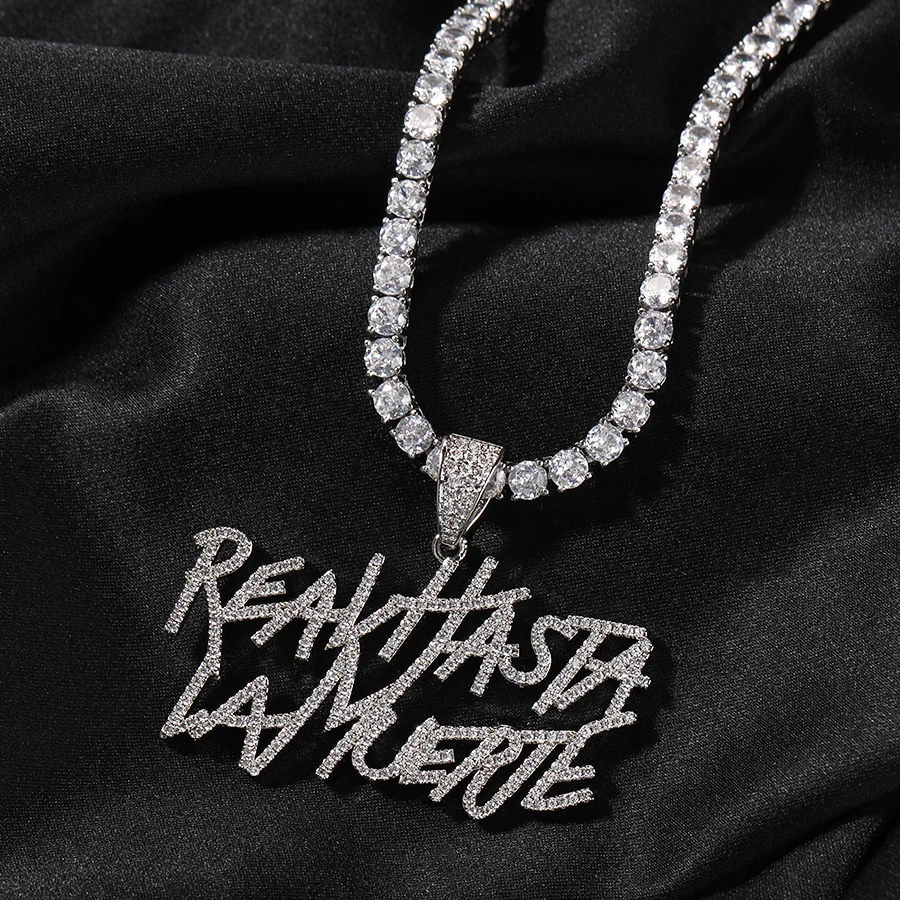 Collier signature hip hop Hasta La Muerte style Anuel AA. Pendentif double rangée lettres en zircon cubique 5A iced out. Design iconique pour soirées. Brillance maximale garantie.