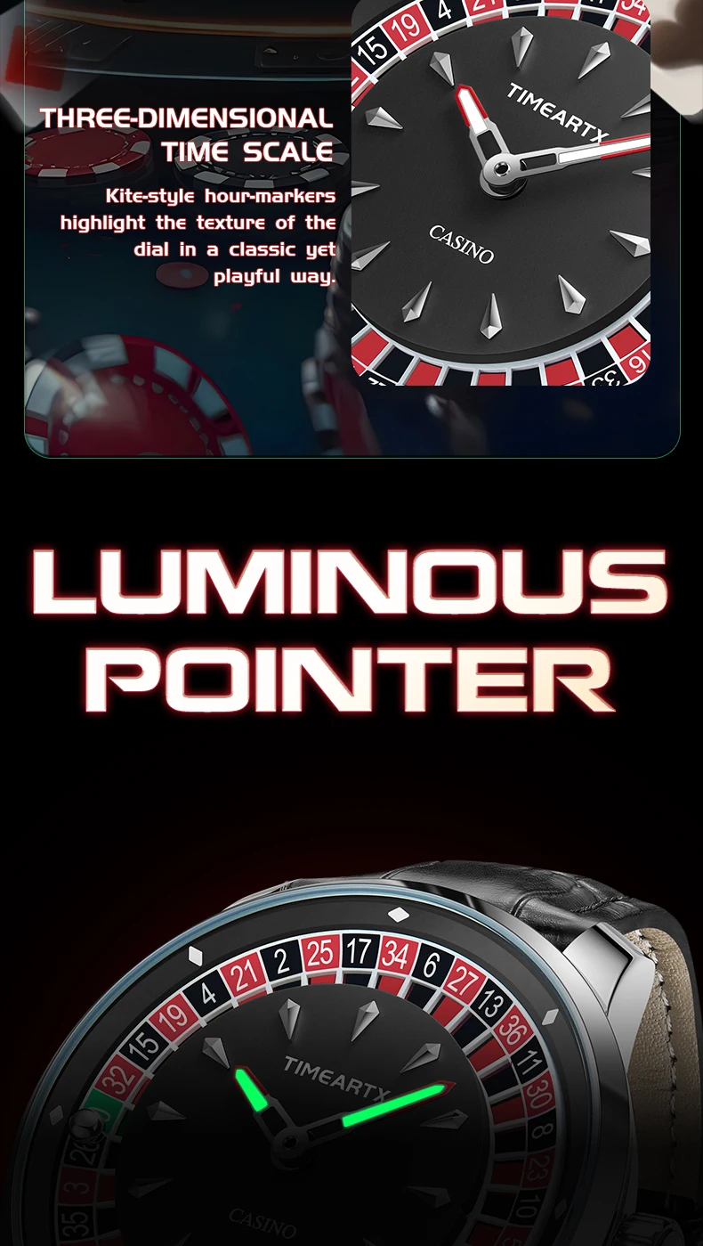Rouletto™ Prestige est une montre pour homme au design audacieux inspiré des jeux de casino européens. Dotée d’un mouvement quartz précis et d’un boîtier en acier robuste, elle allie élégance, originalité et caractère. Un accessoire distinctif pour les hommes au style affirmé.